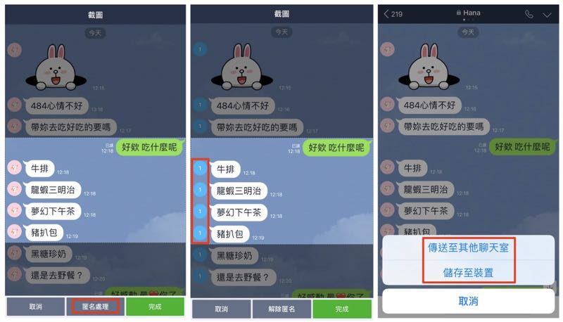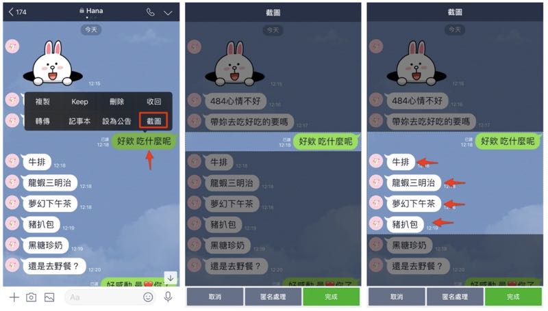 當開啟「聊天畫面截圖」功能,回到聊天視窗中在想要截圖的對話頁面上長按,就會出現「截圖」的選項,就可以開始選取要截圖的範圍。如果想要一次截取多則訊息,只需要點選每一則想要截取的訊息就好,甚至還能夠將對方圖示匿名處理!