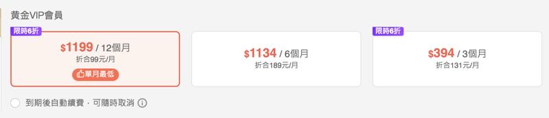 這項優惠活動消費者可以從網頁或是 APP 上來進行購買,不過要注意的是使用 APP 購買的朋友,若是在 12 個月的選項中並沒有出現 NT$1,199 選項的話,可以將底下「到期後自動續費 1 個月」的欄位勾選取消,就能夠看見 6 折後的優惠價格。