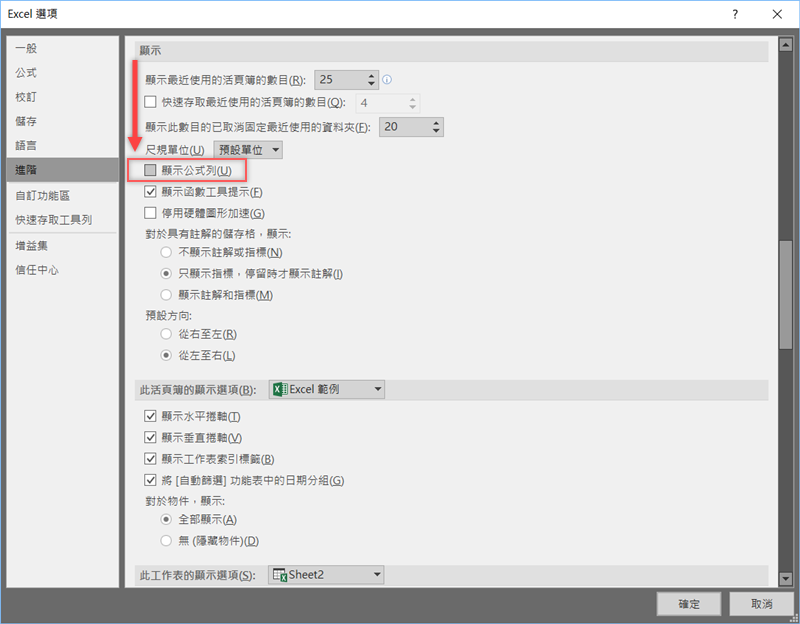 在進階的部分,往下找到顯示,將「顯示公式列」取消即可,反過來說,如果你是發現它不見了,也可以用這個方法讓它重新顯示出來。