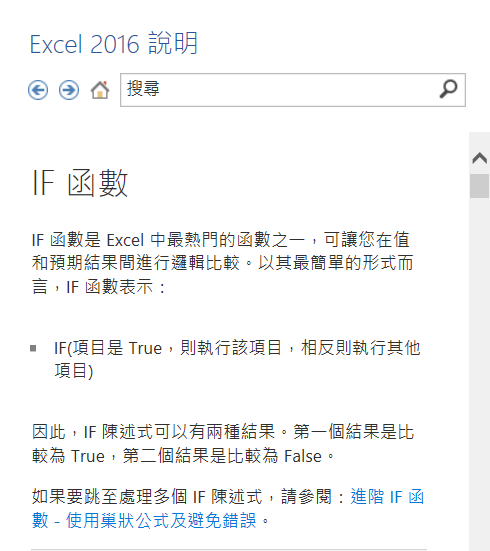 如果再加上左括號「(」變成「=if(」,就會帶出整條提示,不用再另外開啟視窗,這時候如果再用滑鼠點擊開頭的 IF,會連結到函數的詳細說明。