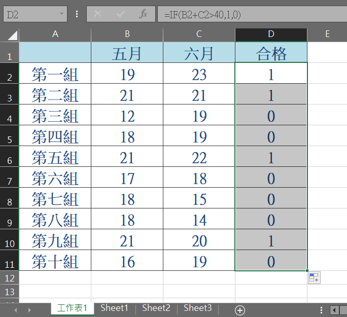 再將算式往下複製結果就都出來了,以範例來說就是如果五月加六月的數字大於 40,再合格欄位就顯示 1,否則為 0,如果對 IF 函數不熟悉的朋友再回去看阿湯的