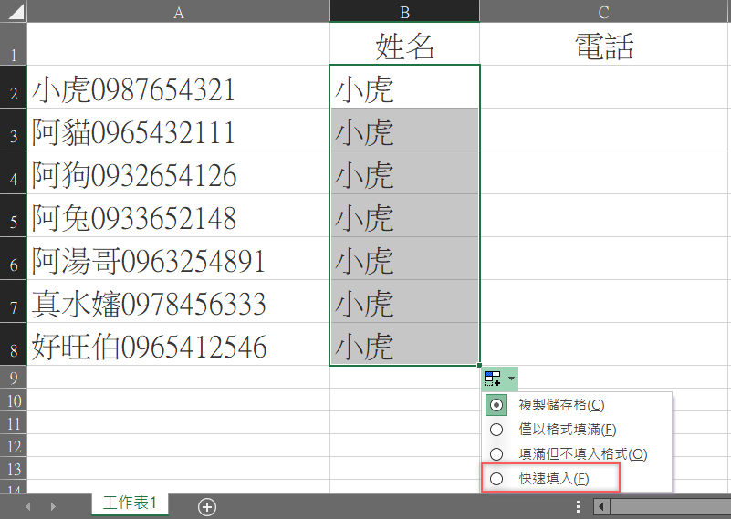 我們要分成姓名和電話兩個欄位,先把第一個名字填入姓名欄。