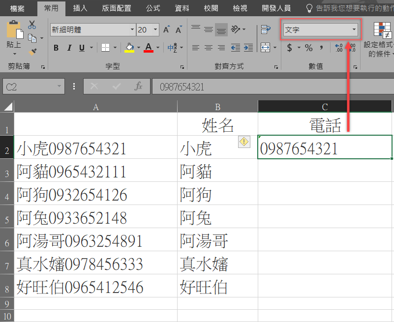 再來輸入電話,記得要更改儲存格格式,不然號碼開頭的「0」會不見,阿湯是將通用格式改成文字。