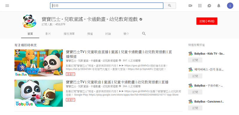鮮豔的 3D 動畫兒歌系列,有 24 小時直播區可以放著給孩子看,角色是動物們和帶奶嘴的 Baby,內容的感覺也是比較適合 6 歲以下甚至更小,字幕主要是純英文的,要看中文的話有其他語言的專區(簡中),和上一個頻道一樣視覺跟聽覺效果都不錯,這兩個頻道阿湯都很喜歡。