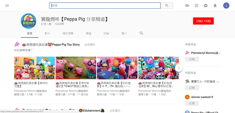 這篇唯一的非原創頻道,是以分享平台的形式收集不少來自英國的學前動畫「佩佩豬」(Peppa Pig),以及多種動物玩具的實境故事,操作得很流暢背後講故事的聲音也 OK(就是一般台灣媽媽的聲音),還有些搭配英文的手作教材、遊戲影片,以及天線寶寶的中文版影片。