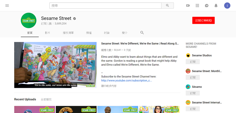 最後來介紹應該大家都知道的芝麻街吧,整體來看也算是綜合性的頻道,唱唱歌、看卡通、讀繪本說故事都有,最常見的就是那隻大鳥和其他布偶演的短劇,內容有的還蠻搞笑的(大人會笑的程度…),也是可以讓孩子一路看到國小的 YouTube 頻道,缺點就是有的影片雖然有 1080HD 和看起來還是有點年代,而且有點吵。