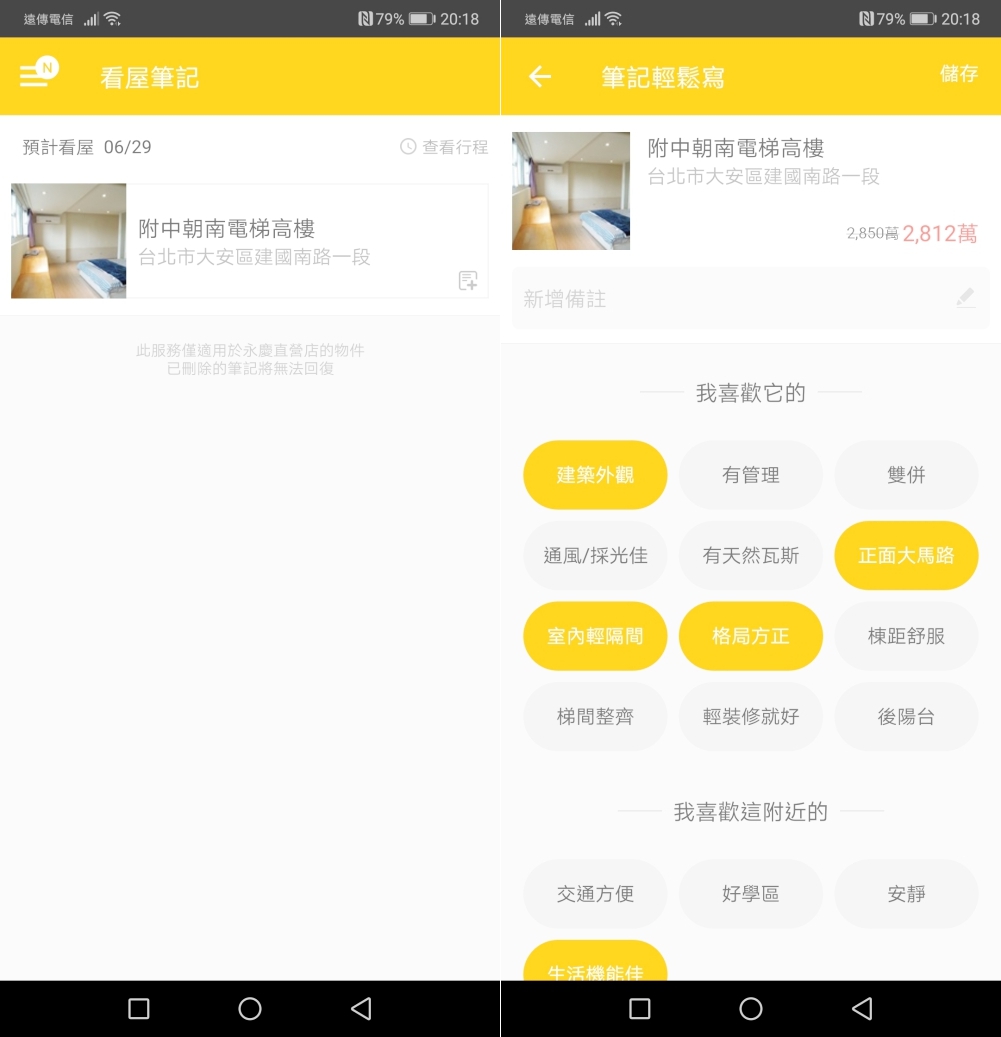 其中最方便的就是內建看屋筆記,只要你預約看屋後,就會自動顯示物件在看屋筆記內,讓你到了現場看房子時可以快速的進行筆記。而且不用所有的東西都自己打字打半天,已經內建很多基本選項讓你點選,快速的記下重點,非常的便利。
