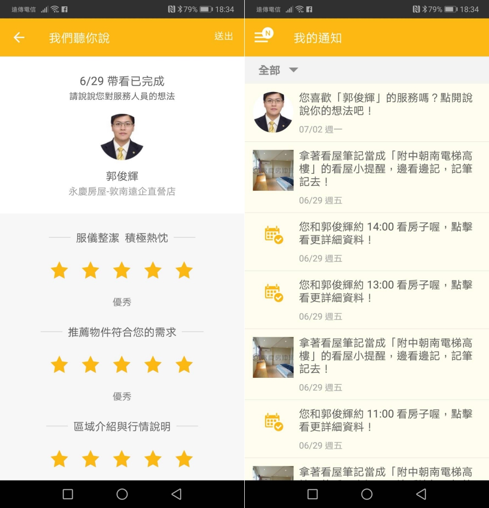 當你每次給經紀人帶看完物件後,在通知裡也都會詢問你對經紀人的評價,相信有這樣評比機制可以做為永慶房屋內部的考核機制之一,幫大家把關好經紀人的服務品質,讓大家在看屋時可以更愉快的挑選心中喜愛的房子啊。