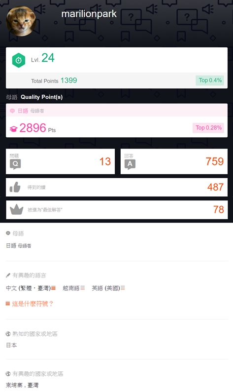 也能查看網友的個人資料,問題和回答的數量、得到的讚數、語言資訊和程度等等,感覺跟奇摩知識家有點像,大家都可以在平台互動、獲得點數來成為大師,有興趣就來加入吧。
