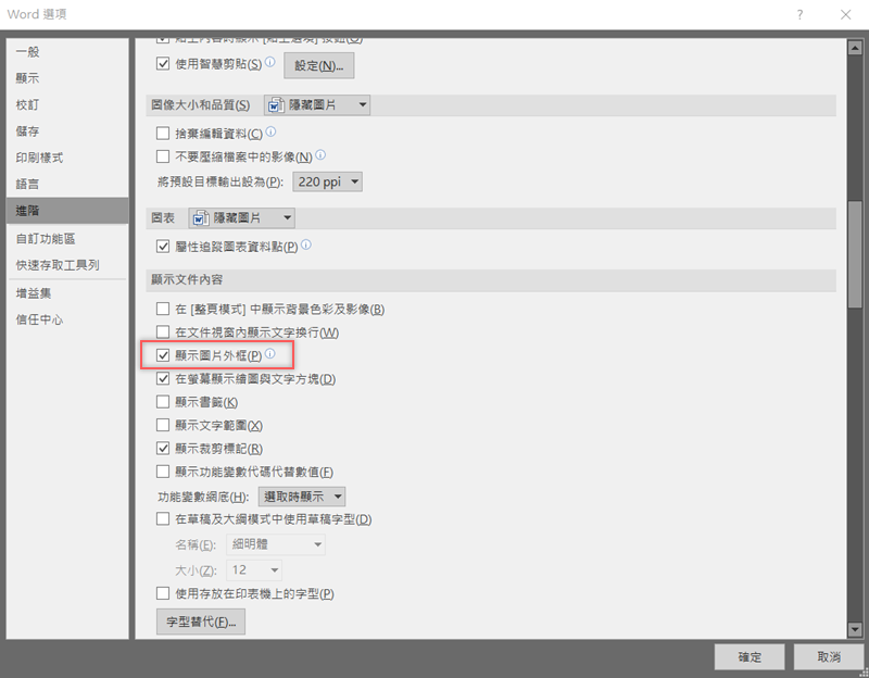 進入檔案 → 選項,在進階這區往下找到「顯示圖片外框」,將它勾選起來。