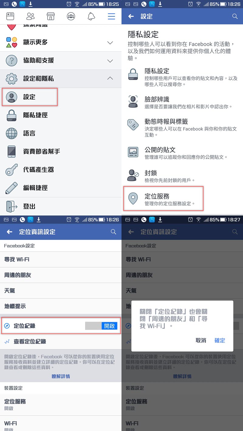 那如果不想要被紀錄呢?當然是可以關閉的,不過必須使用你的手機(畢竟手機才會跟著你),開啟臉書 APP 進入設定,找到定位服務裡的定位紀錄,點關閉即可,但周邊的朋友跟尋找 Wi-Fi 功能也會無法使用,就自己取捨吧。