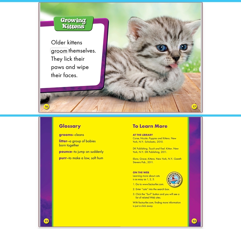 像這本小貓咪成長介紹,在閱讀的時候會顯示讀到哪個單字,速度適中,發音非常標準又清晰,大約五分鐘,最後還有詞彙表列出重要單字協助背誦,以及書籍相關資訊。
