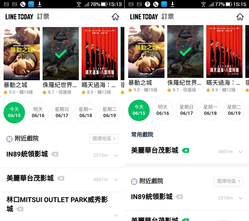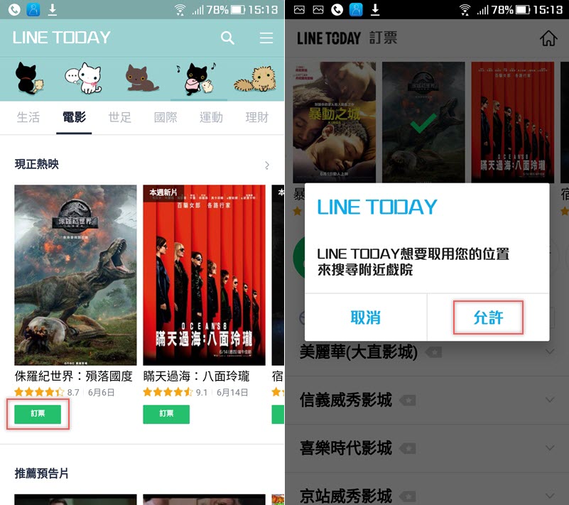 來看現在最紅的侏羅紀世界好了,進到 LINE TODAY 按下訂票,會要求取得你的位置來搜尋附近的電影院。