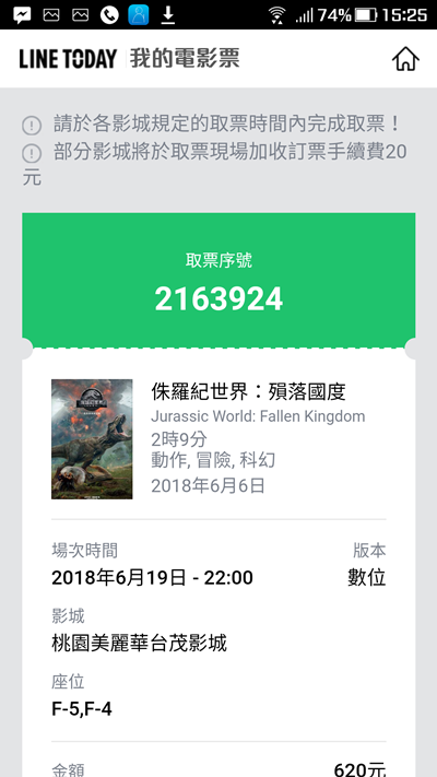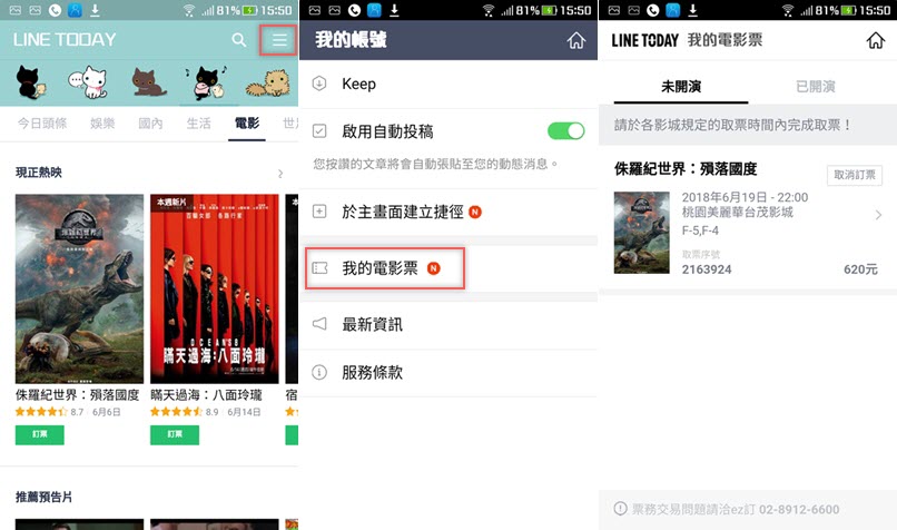 這份資料也會保留在你的手機裡,在 LINE TODAY 頁面進入右上角清單,看到「我的電影票」這項,點進去就是你的購票資訊,再點進去就是上一步的取票圖片,大家用用看吧。