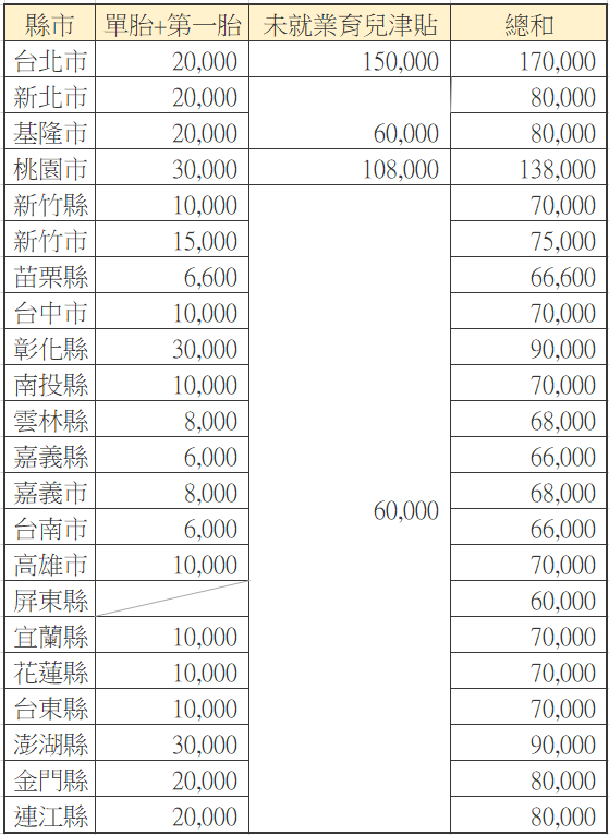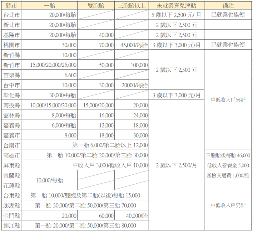 - 生育補助:第一胎 1 萬元、第二胎 1 萬 5 千元、第三胎 2 萬元、第四胎 5 萬元、第五胎 10 萬元(每胎為多胞胎另計)