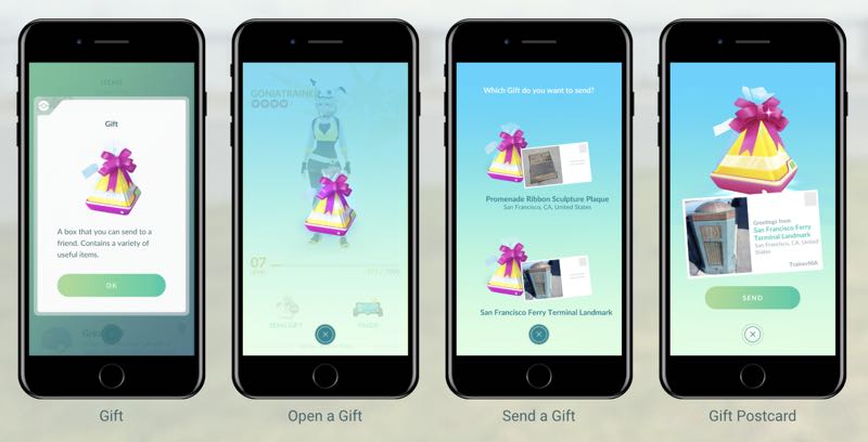 在新增朋友功能後,訓練家在旋轉寶可補給站和道館的轉盤時,除了會獲得自己的道具外,還可以獲得特別的「友情禮物」。雖然這份禮物無法自己開啟,但可以將它贈送給朋友名單上的朋友。友情禮物的內容包含了道具和能這顆蛋裡孵出阿羅拉樣子的寶可夢特殊蛋。贈送友誼禮物時,系統會為你附上一張註明獲得友情禮物地點的明信片,甚至還能用友情禮物來告訴朋友你現在在何處旅行。