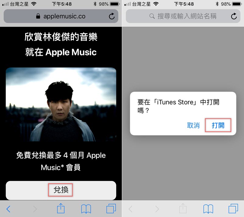這次活動分別提供了台灣及香港的使用者不同的網頁,請見文末的連結,使用手機裡的 Safari 瀏覽器開啟網頁點擊兌換,選擇在 iTunes Store 打開。