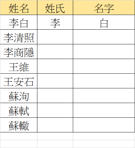 下面這些古代文人大家應該多少有聽過,古人很喜歡取單名,現在台灣人比較少見,但只要有出現在你的表單就是要一起處理,開始吧,在姓氏這欄第一格輸入公式: