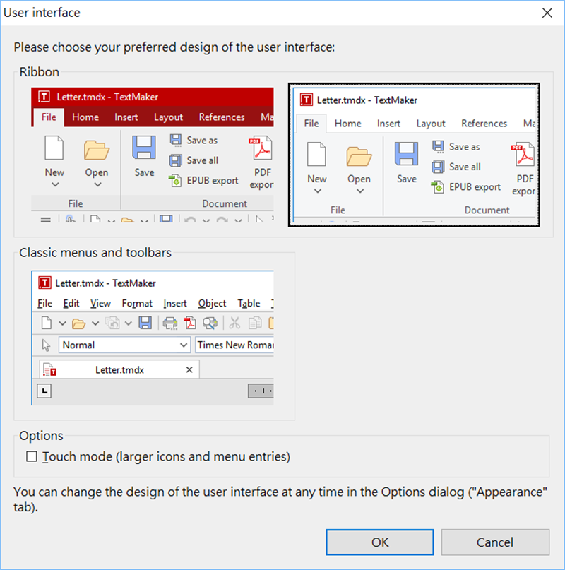 打開 TextMaker,提供三種介面設計,也有觸控模式可選。