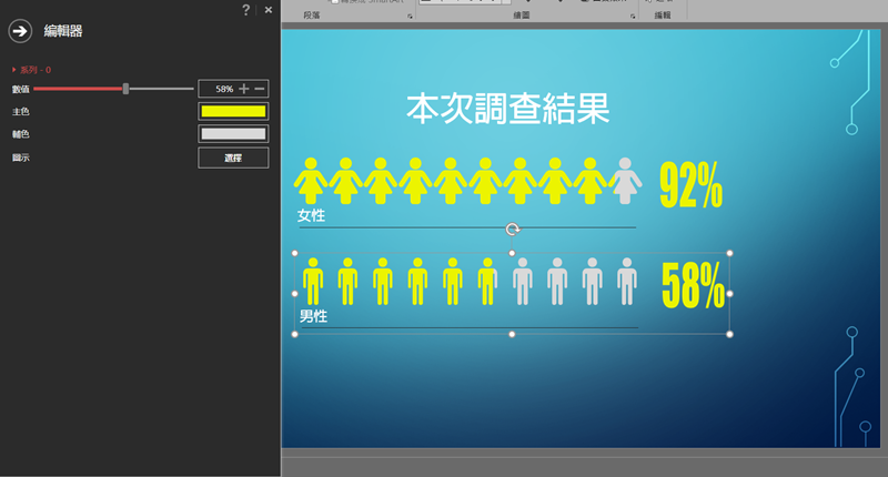 再來看這款人型圖表,就很適合拿來表現男女比例相關的統計數據,在編輯細節的地方還能更改成其他圖示。