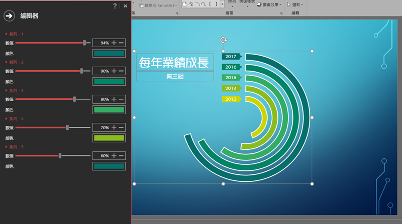或是像這種圓弧線段的樣式,就能拿來做歷年累積的某種數值比較,阿湯就用做常見的業績表,配合漸層的綠色比一般圖表更生動。