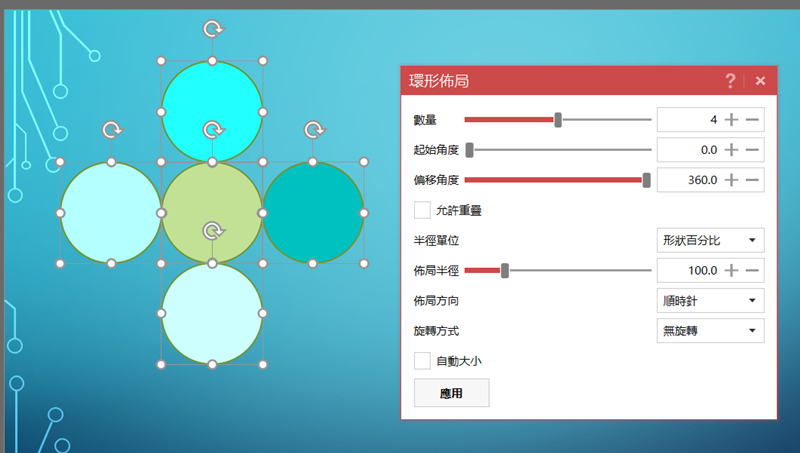 如果想自己從頭設計也是 OK 的,例如畫一個圓形後 Ctrl+C 大量複製,並填上不同色彩,然後點進設計排版的功能選擇想要的編排方式,例如環形佈局。