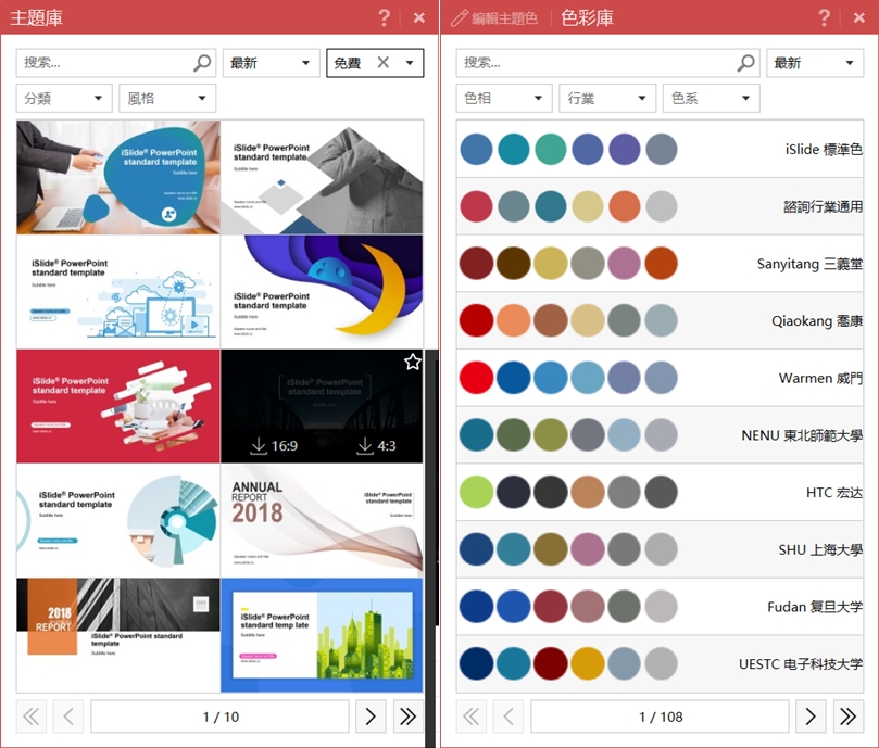 帶大家逛一下主題庫和色彩庫,都可選擇類別,基本上商用簡報會用到的樣式應該都找得到,配色也有來源可參考。