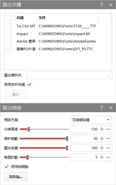 如果要匯出字體就會列出檔案內的所有字體讓你勾選,視頻的話可設定分辨率、品質、每秒幀數、每頁秒數。