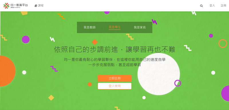 這個 2012 年創立的網站,目前(2018 年)已經有 115 萬人註冊,共 1 萬 3 千多部影片,4 萬多個練習題,內容真的是相當的龐大,先選擇你是教師、學生或家長進入。