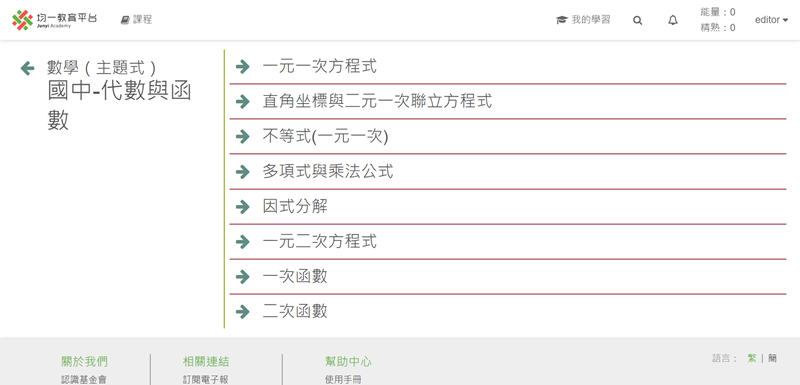 以數學來說有分主題式和年級式,來看國中數學代數與函數這門課程,共八個章主題,點進去還有再細分章節。