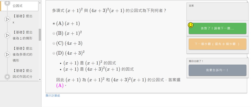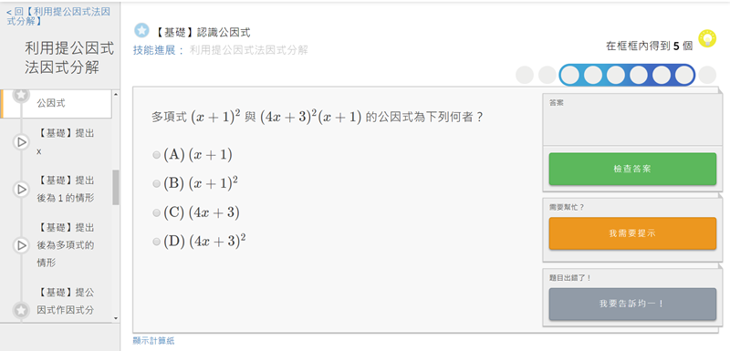 要驗證有沒有學起來作題目是最快的方式,像這個選擇題就點選答案後,再按檢查答案,或是看提示,如果題目有誤也能回報。