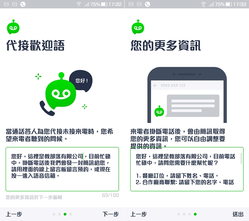 雖然是 APP,但也可以綁定市話,大家主要還是會用在手機吧,選擇電信業者後輸入號碼以及傳達給來電者的名稱,並選擇情境,包括預約、洽詢或自訂,系統會依選項建議代接內容。