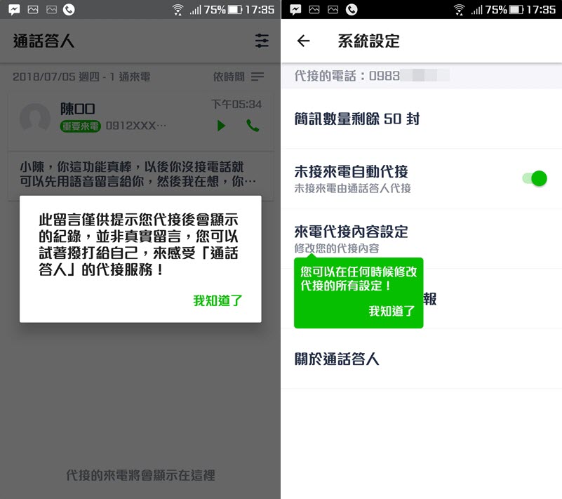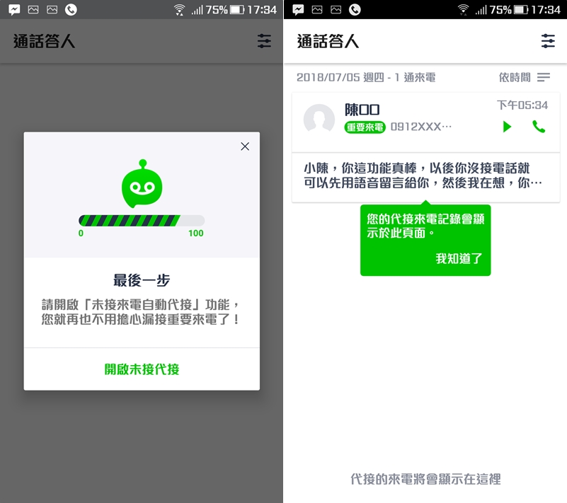 最後再開啟「未接來電自動代接」功能就完成了,代接來電會收錄在清單中,並顯示名稱、電話號碼和來電時間。
