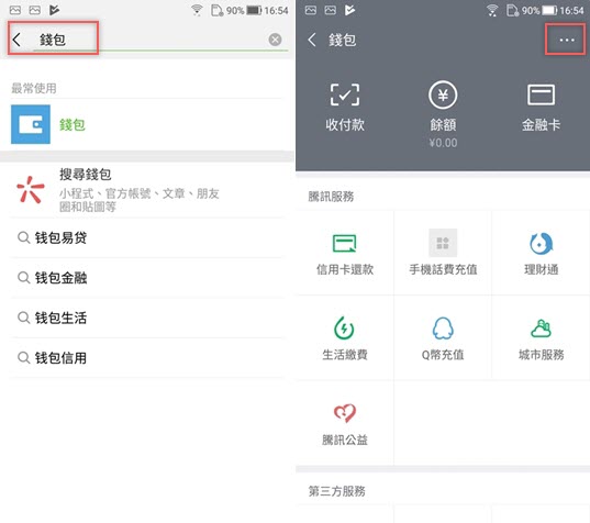 先提醒大家,目前微信官方並沒有公告海外實名方式的相關內容,可能是採用了一種特殊的檢查機制,如果按照下面的方法還是不成功,建議直接聯繫微信客服,開始吧,進入微信後搜尋「錢包」,然後在錢包頁面點右上角清單圖示。