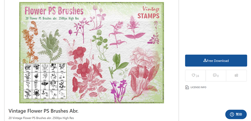 隨便選一款花草主題的筆刷,共 20 種,水墨風渲染得相當好看,按 Free Download 下載,這款是免費可個人及商用,但需要提供來源,建議下載前都看一下許可證比較好。