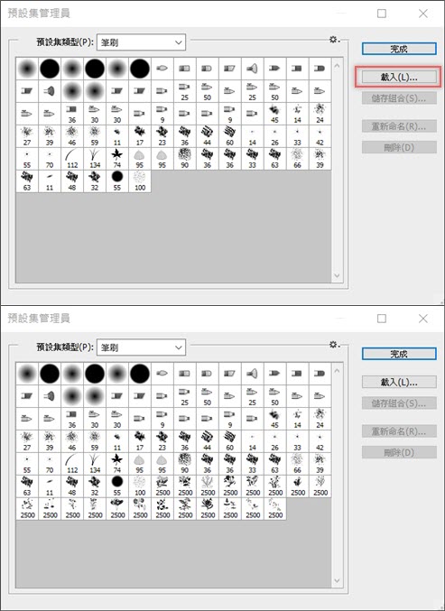 連到預設集管理員視窗,點「載入」,選擇剛剛下載的資料夾裡的 .abr 檔,匯入 20 款筆刷後,點完成。