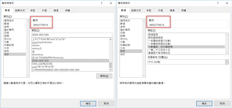或是切換到「特殊」,在底下選擇「行動電話、呼叫器號碼」,就可以看到範例改變了。