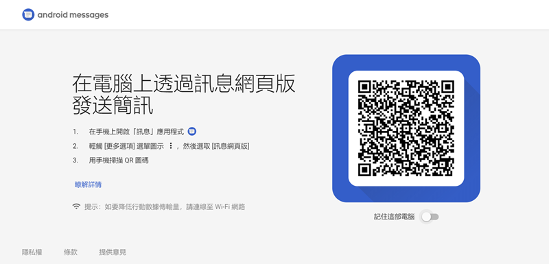 另一方面,在電腦端開啟瀏覽器連到 Android Messages,掃描 QR Code,如果常用的話可以開啟「記住這部電腦」。
