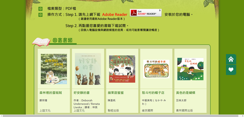 主要分為圖畫書類、科學、人文及社會、文學、叢書及工具書、漫畫及雜誌,可點上面的分類連結,或首頁直接往下瀏覽,提供書名、作者及出版社,點封面進入。