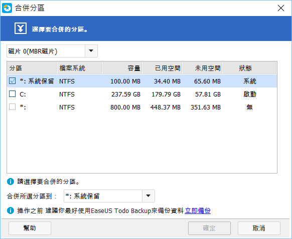 合併分區也很好操作,選擇要處理的部分即可開始,執行這些動作之前都建議先做備份。