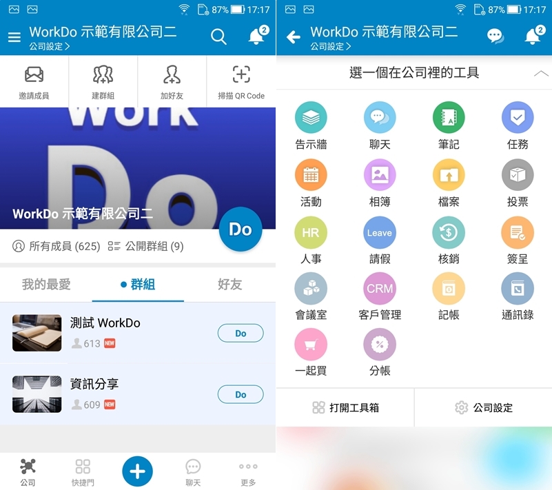 為了快速帶大家試用功能阿湯就加入了示範公司,首頁可以看到現有兩個群組,也能使用上方的按鈕邀請成員、加好友,點封面照片右下的 DO 會展開所有工具,包括告示牆、聊天、筆記、任務等 18 的項目。