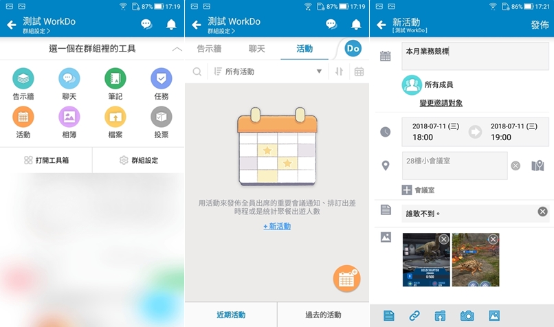 群組設定這塊應該是最常用的,來辦個活動吧,輸入主題、邀請成員、時間地點,並加入備註、附檔或圖片,發出去看看。