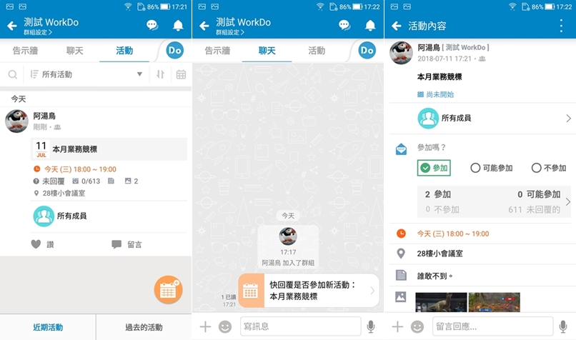 活動區的 PO 文在聊天區也會顯示,成員會收到通知提醒你尚未答覆,再點進去回要不要參加即可。