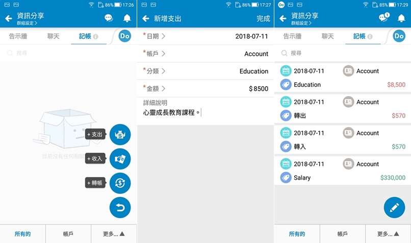 財務管理是公司的必備功能,使用 APP 記帳還能幫你統計,分為支出、收入、轉帳,都能編輯內容,蠻方便的。