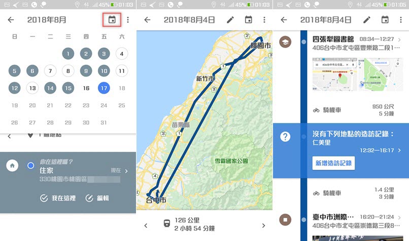 Google 地圖的跟蹤功能有人覺得恐怖,但查看移動軌跡還是很好用的,開啟日曆選擇日期,就能知道當天的行走路線、什麼時間點到哪裡,待了多少時間和拍了那些照片也會一併紀錄,也能自行更改細節。
