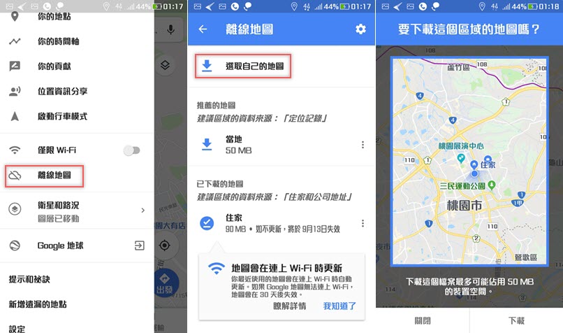 可以選擇當地地圖或選取範圍自訂,最多可佔用到 50MB 的裝置空間,而地圖也會在連上 Wi-Fi 時自動更新,保持最新狀況。