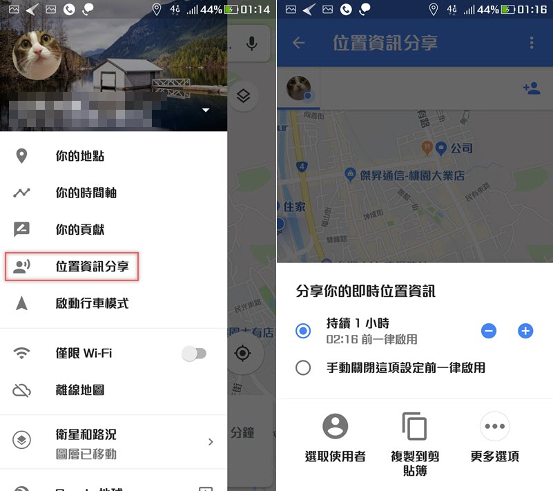 開啟位置資訊分享,並設定持續時間、選取使用者,就能和朋友共享你的地點,不只可開放給想追蹤你的人,對於常常迷路、不知身在何方的人應該不錯用(詳情可看
