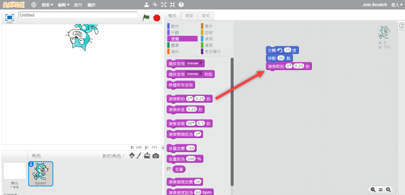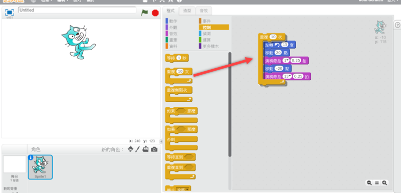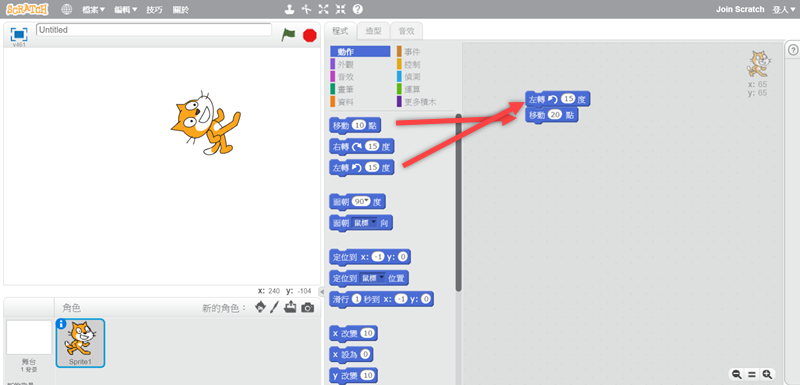 開始玩吧,左邊空白區是效果預覽,中間是各項程式的指令,右邊灰色是編輯區,先來加入動作,假設我們要讓這隻貓移動並左轉,就將指令拖進去,角度和點數都可點擊更改。