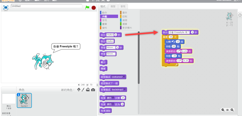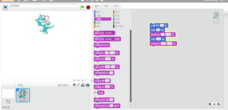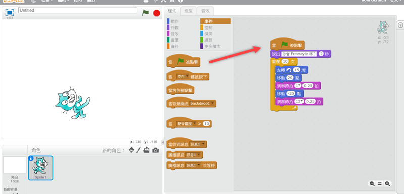 阿湯在中間再次加入移動指令,讓這隻貓咪可以隨著節拍移動,並點擊預覽。