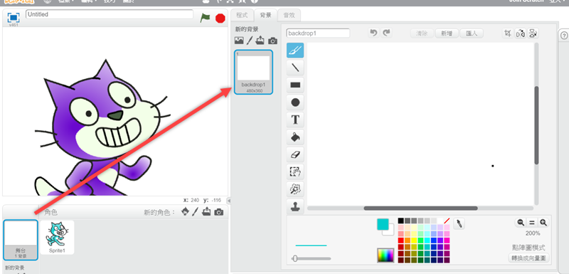 背景白色太單調,點選舞台來編輯背景。
